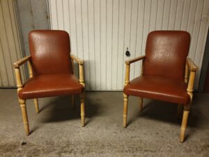 Paire de fauteuils vintage, structure en bois stable et fonctionnelle.
